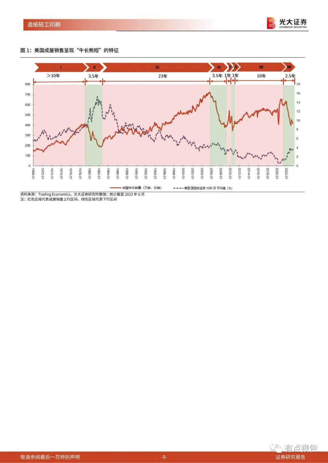 2023年1月,美国成屋的销量跌至400万套,2023年2-6月,虽然美国仍处于加息通道,但美国成屋年化销量持续保持在稍高于400万套的位置,筑底信号明确。新房方面,2022年10月-2023年1月、2023年3月-5月,美国新房年化销量累计环比上行7个月,复苏趋势确立。
