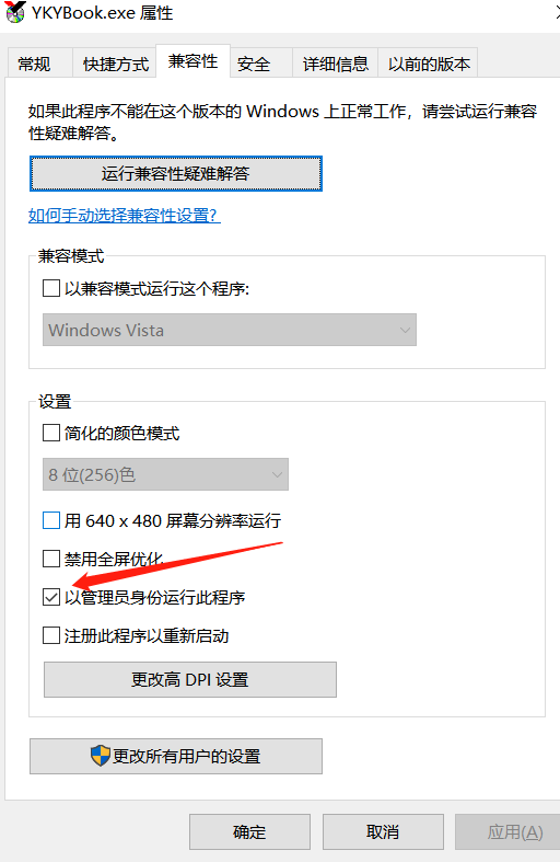 右键属性 → 兼容性 → 以管理员的身份运行 → 确定