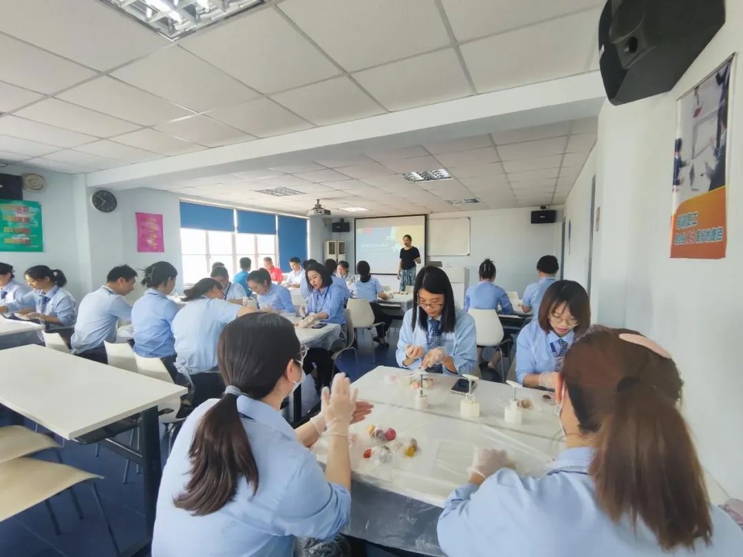 在这个年轻人越来越钟爱复古风、新中式风的时代,点心界也迎来了国潮风格。活动现场,在沈老师讲解示范后,职工们自己动手制作国潮风格的糕点,一边听着沈老师讲解国潮糕点的特色,一边认真地备皮、称重、分皮、包馅、压膜,一个个“大宅蟹”、“醒狮”、“祥云”、“花生”等模型的糕点呈现在自己面前,色彩缤纷、颜值爆表,一股民族文化的自豪感、幸福感油然而生。