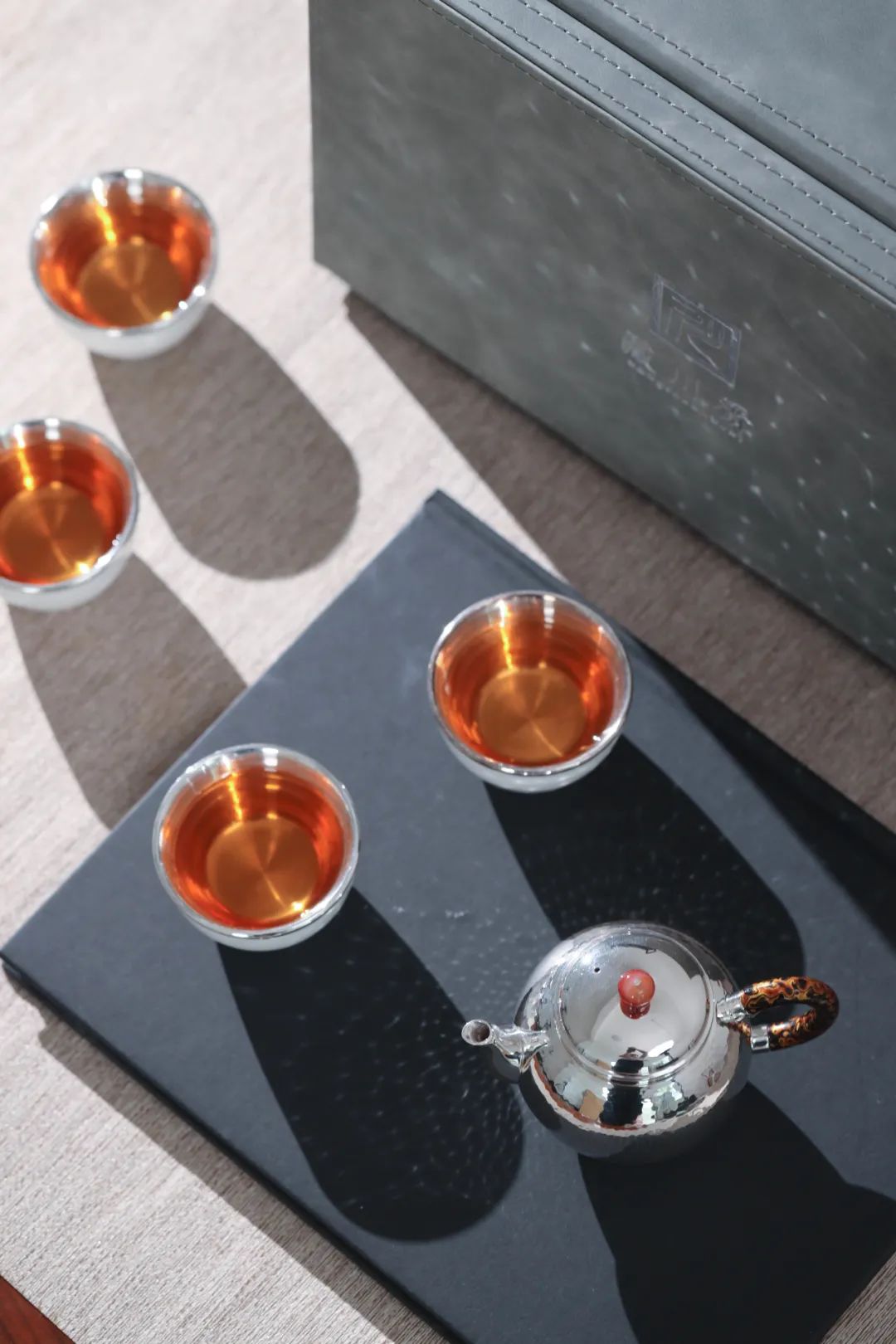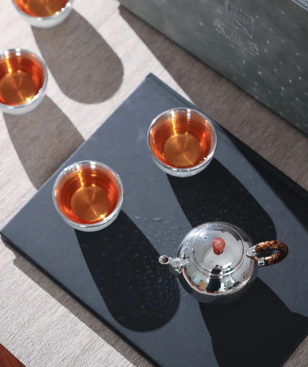 壶把采用大漆手绘髹饰工艺,色彩搭配靓丽轻快,尽显荣雍华贵,同时美观隔热适手。