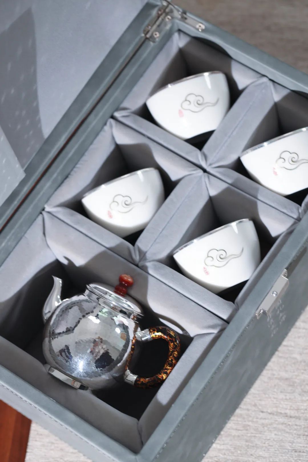壶纽以南红玛瑙搭配,不但靓丽圆滑又兼具防烫的功能,玛瑙古称“赤玉”,是佛教圣洁七宝之一,质地细腻油润,作为中国独有的品种,自古以来被当作为辟邪、护身使用。