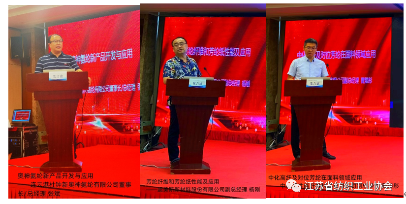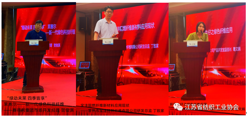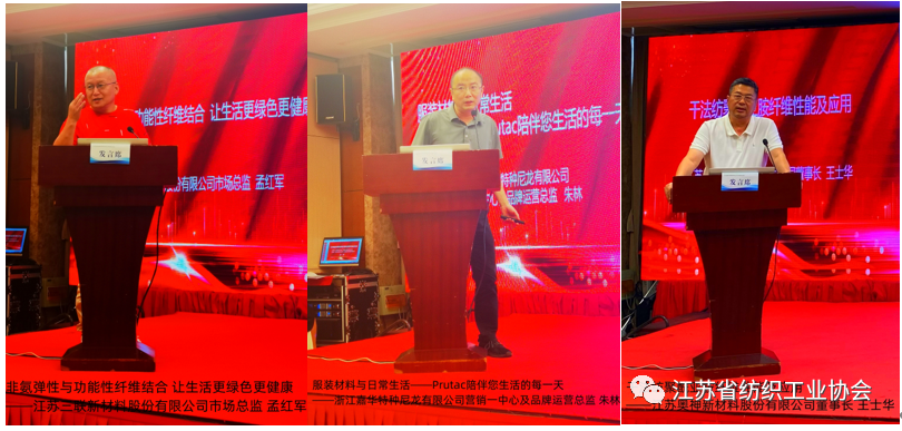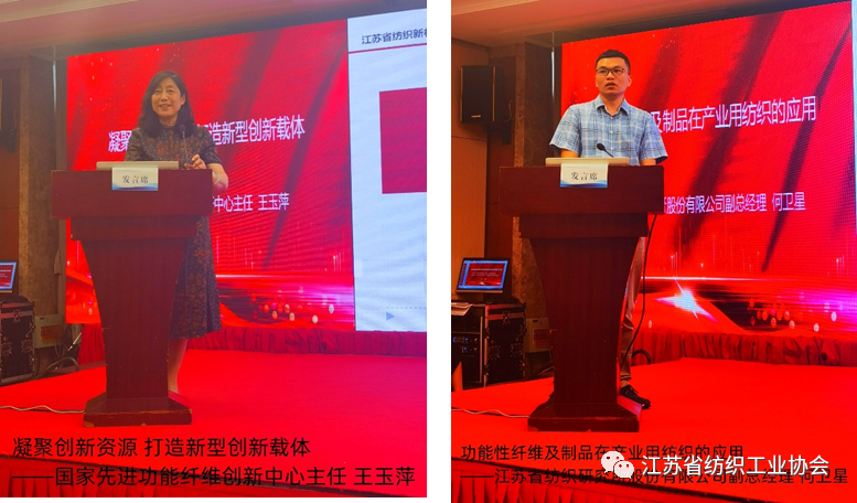 在主题报告环节,国家先进功能纤维创新中心主任王玉萍,江苏三联新材料股份有限公司市场总监孟红军,浙江嘉华特种尼龙有限公司营销一中心及品牌运营总监朱林,江苏奥神新材料股份有限公司董事长王士华,连云港杜钟新奥神氨纶有限公司董事长/总经理张斌,超美斯新材料股份有限公司副总经理杨刚,中化高性能纤维材料有限公司副总经理曹煜彤,赛得利集团市场开发经理贺俊淇,常熟市宝沣特种纤维有限公司研发总监丁致家,黑牡丹纺织有限公司产品开发室副部长葛文娟,江苏省纺织研究所股份有限公司副总经理何卫星十一位专家做了主题报告。从国家先进功能性纤维创新中心系列新型纤维材料,到“非氨弹性与功能性纤维”,尼龙66,聚酰亚胺,氨纶,对位芳纶,间位芳纶,新一代绿色生物基纤维—莱赛尔以及常熟宝沣安全防护产品开发和常州黑牡丹环保牛仔绿色纤维应用,从多个方面、多个系列介绍了我省新材料创新研发和后端产品开发应用信息,展示了我省纺织新材料的最新发展状态和产业链发展成长空间。