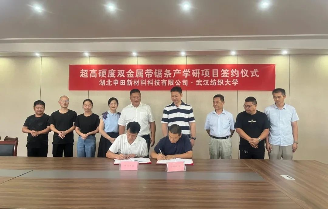 8月25日,湖北申田新材料科技有限公司与武汉纺织大学在龙感湖举行产学研项目签约仪式,签订超高硬度双金属带锯条研发合作协议。武汉纺织大学机械与自动化学院院长、教授余联庆,副教授袁志刚,龙感湖管理区委副书记於春明,区科技局党组书记、局长杨俊,湖北申田新材料科技有限公司总经理孔祥君及企业相关负责人参加签约仪式。