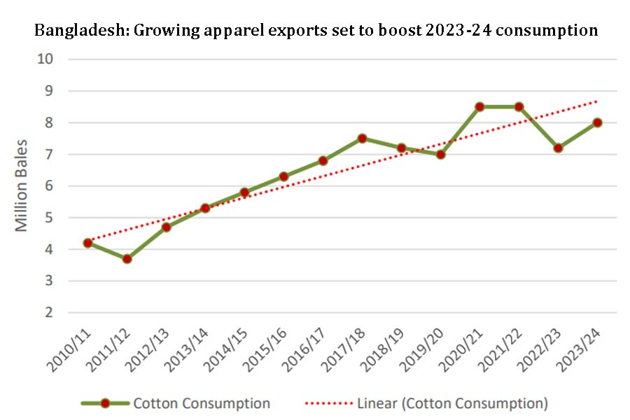 在孟加拉国,几乎所有棉纱(棉花消费)都供应给了其强大的面料和服装行业。服装出口能带来美元外汇,对促进孟加拉国经济增长和稳定本币汇率非常重要。