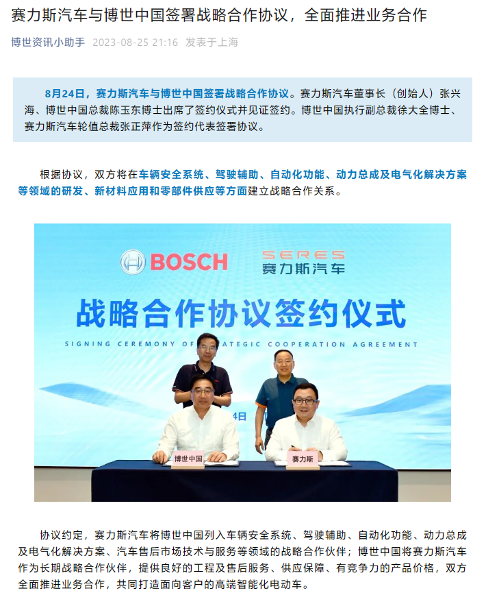 结果显示每公斤海水中氚浓度低于 10 贝克, 低于标准值。但是,美国化学家指出:日本方面提供的数据并不透明和全面,无法证明其核污染水排海安全性的说法。韩国媒体发文称,日方目前一直通过各种手段,来阻止他国对福岛海水进行独立验证。近日,蚂蚁链摩斯通过四项国产"产品兼容性"认证。这四项产品分别为:华为鲲鹏服务器 Kunpeng 920、海光 3000 / 5000 / 7000系列 CPU;中科可控 R62 系列 / R52 系列 / R32 系列 / R64 系列服务器、麒麟高级服务器操作系统 V10 系列。完成兼容性互认,意味着彼此之间可以顺利安装、配置,并稳定运行,这对于中国自研体系的建立和完善都有着很大的意义。8 月 26 日,博世中国公众号宣布,赛力斯汽车与博世中国签署战略合作协议。双方将在车辆安全系统、驾驶辅助、自动化功能、动力总成及电气化解决方案等领域的研发、新材料应用和零部件供应等方面建立战略合作关系。