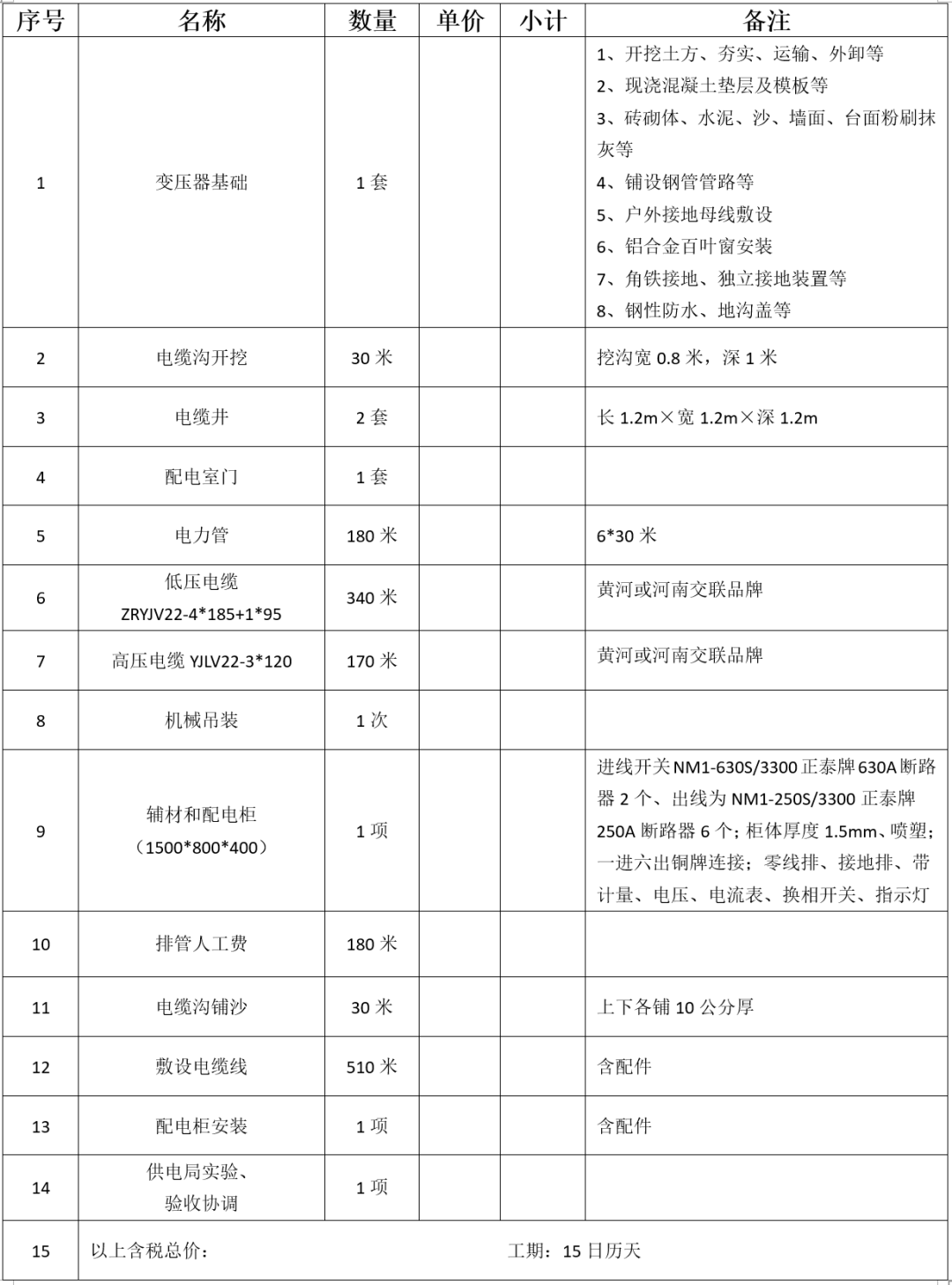 1、投标人必须具有完全民事行为能力,具有独立法人资格并依法取得企业营业执照,营业执照处于有效期;在人员、设备、资金等方面具备相应的施工能力,施工信誉度高。2、企业具备建设行政主管部门核发的市政公用工程施工总承包三级及以上施工资质或送变电工程专业承包叁级及以上资质。3、企业具有有效施工企业安全生产许可证,安全生产许可证处于有效期;4、投标人必须实地查看施工现场,未报名人员不得参与本次投标,在我校已有两项未完工程不得参与本次投标。5、施工过程中对周围建筑物及附属设施造成损坏的必须无条件恢复原貌。8、招标公告最终解释权归登封少林中等专业学校所有。9、投标人根据图纸、清单及现场查看情况自行编制投标文件,投标文件除常规公司资质等材料外,必须包含施工方案、进度计划及详细报价清单,现场按照竞价方式竞标,竞价表格式如下: