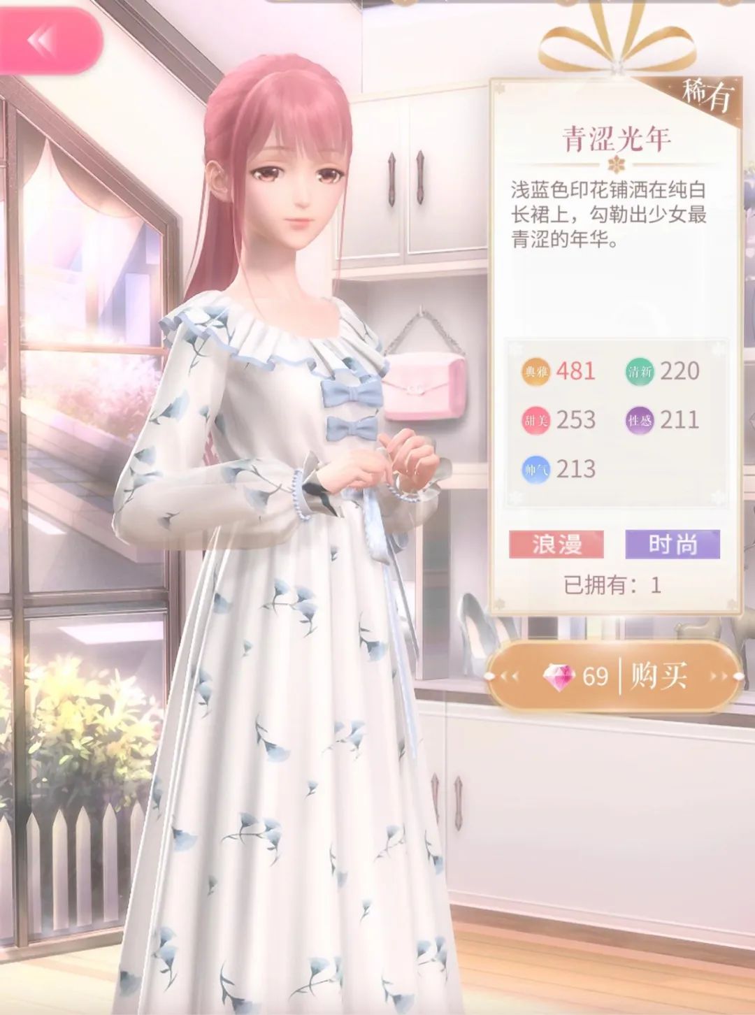 “浅蓝色印花铺洒在纯白长裙上,勾勒出少女最青涩的年华。”
