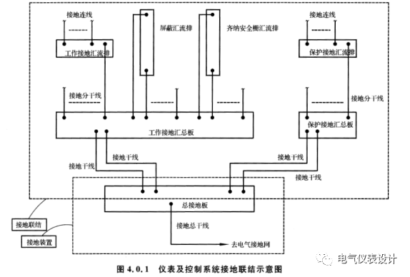 接地连接包括接地连线、接地汇流排、接地分干线、接地汇总板、接地干线。接地装置包括:总接地板、接地总干线、接地极。