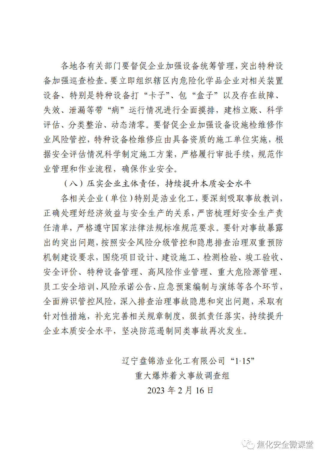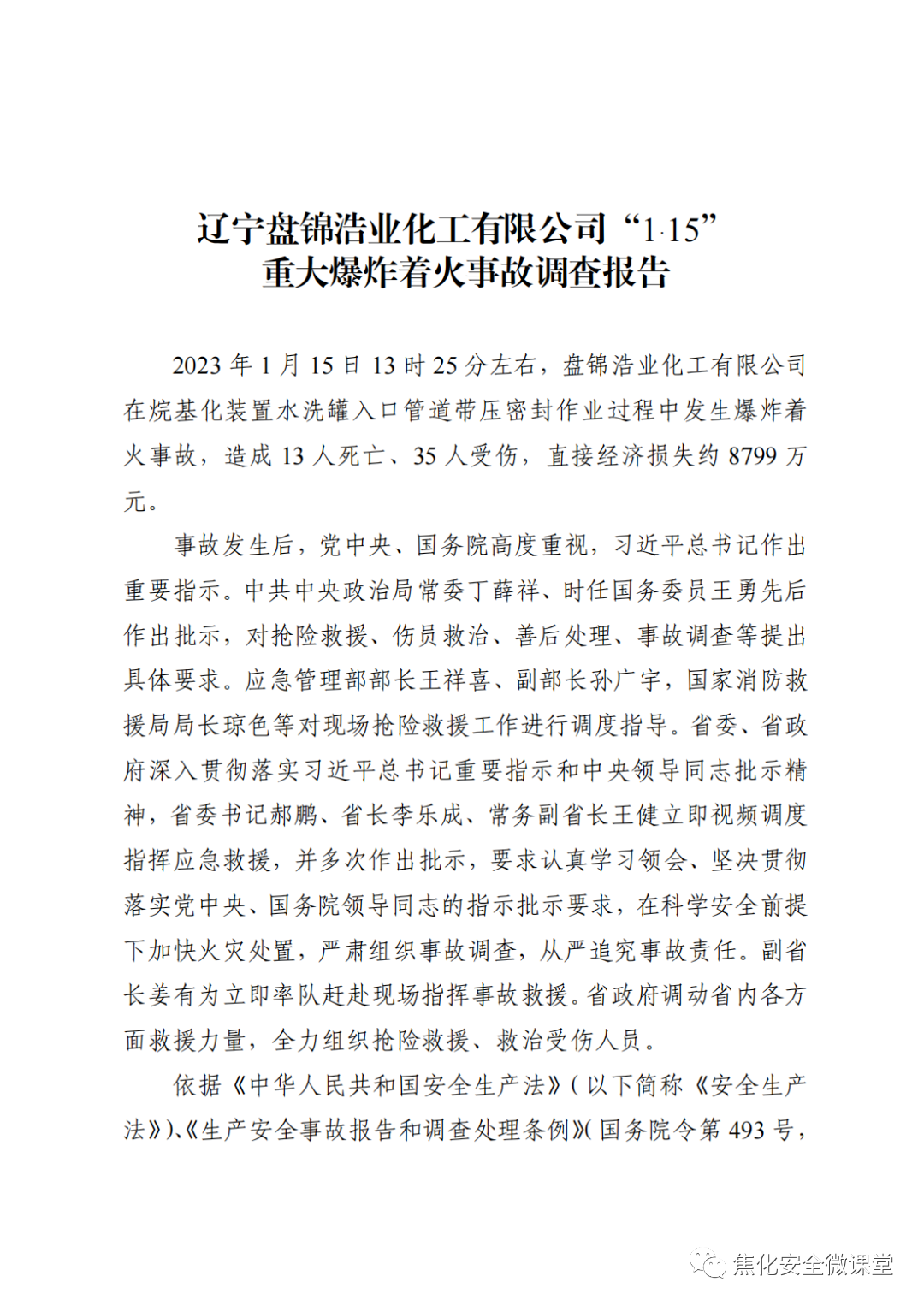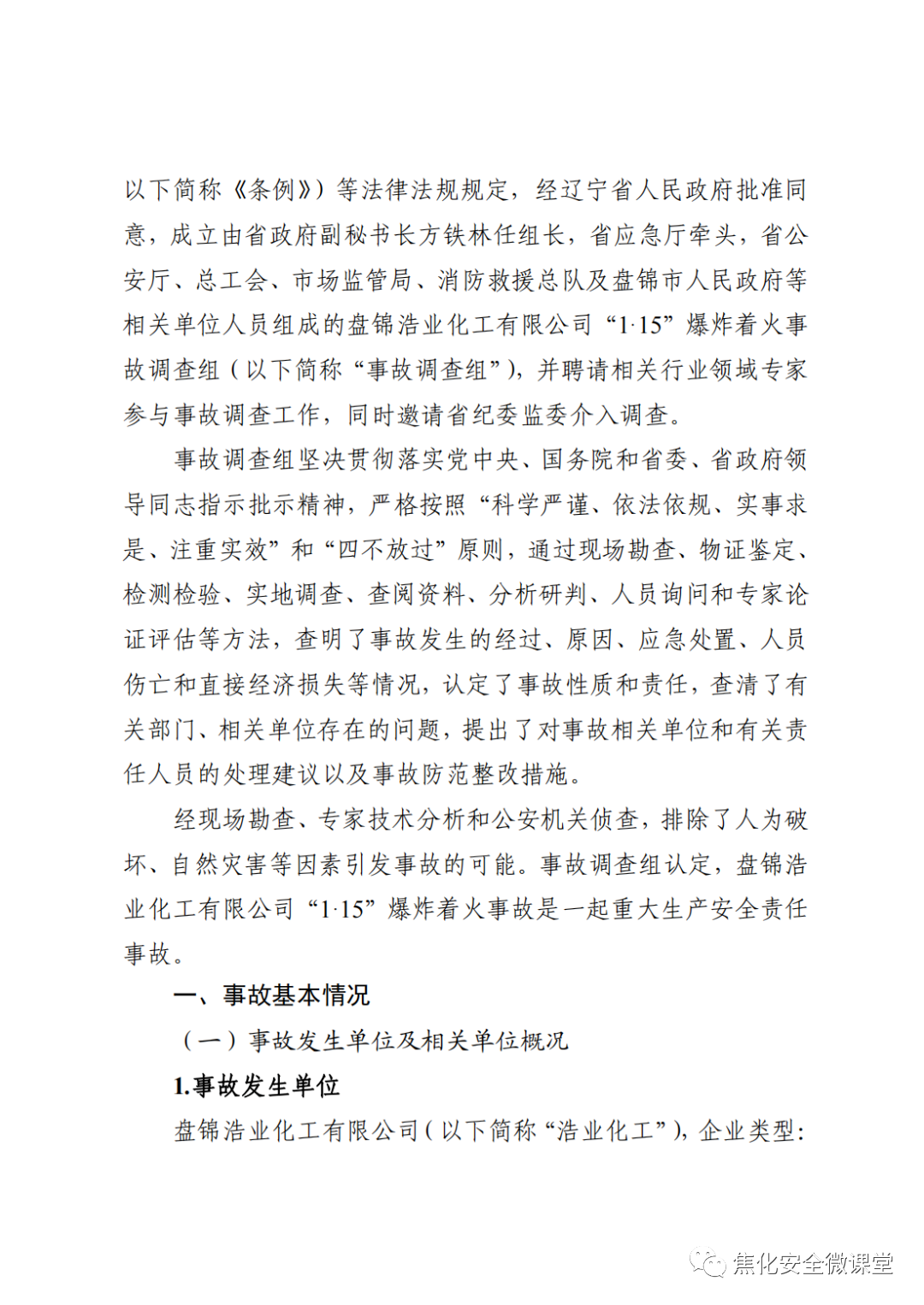 【事故调查报告】辽宁盘锦浩业化工有限公司“1·15”重大爆炸着火事故调查报告公布