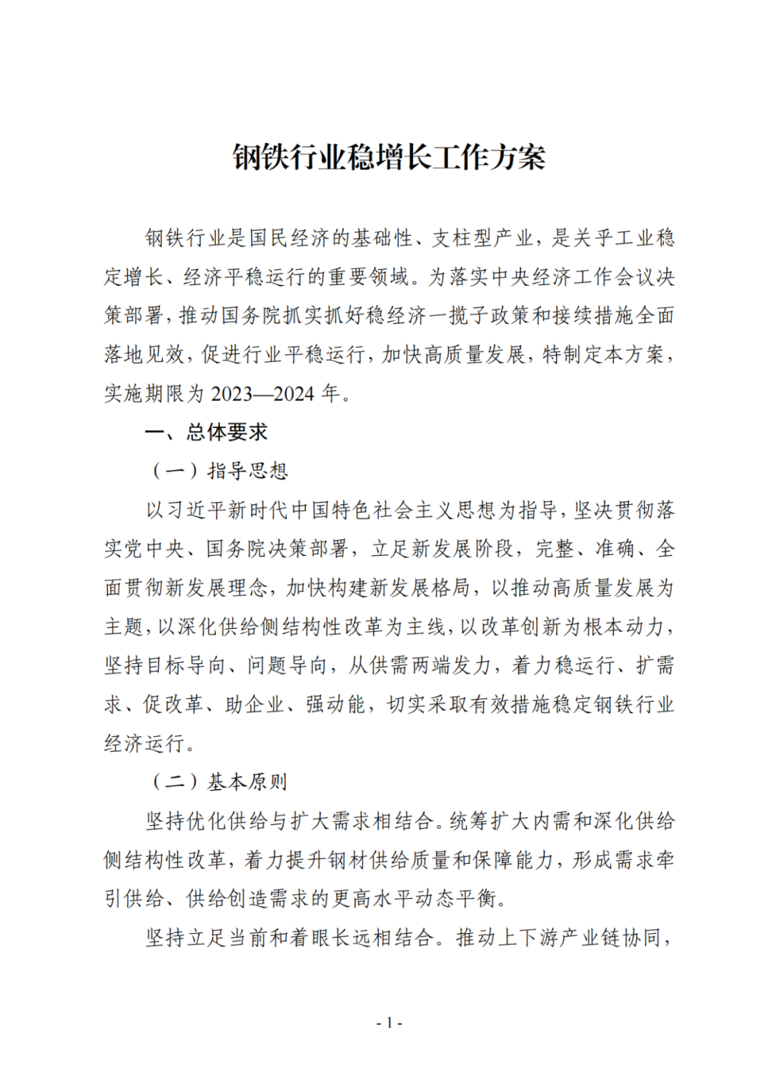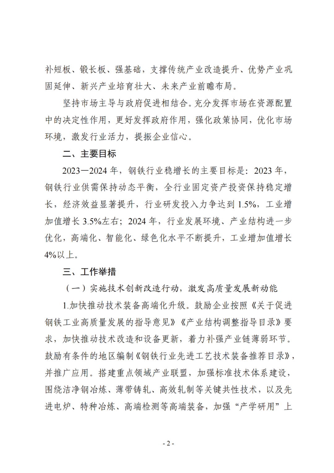 文件指出主要目标:2023—2024 年,钢铁行业稳增长的主要目标是:2023 年,钢铁行业供需保持动态平衡,全行业固定资产投资保持稳定增长,经济效益显著提升,行业研发投入力争达到 1.5%,工业增加值增长 3.5%左右;2024 年,行业发展环境、产业结构进一步优化,高端化、智能化、绿色化水平不断提升,工业增加值增长4%以上。