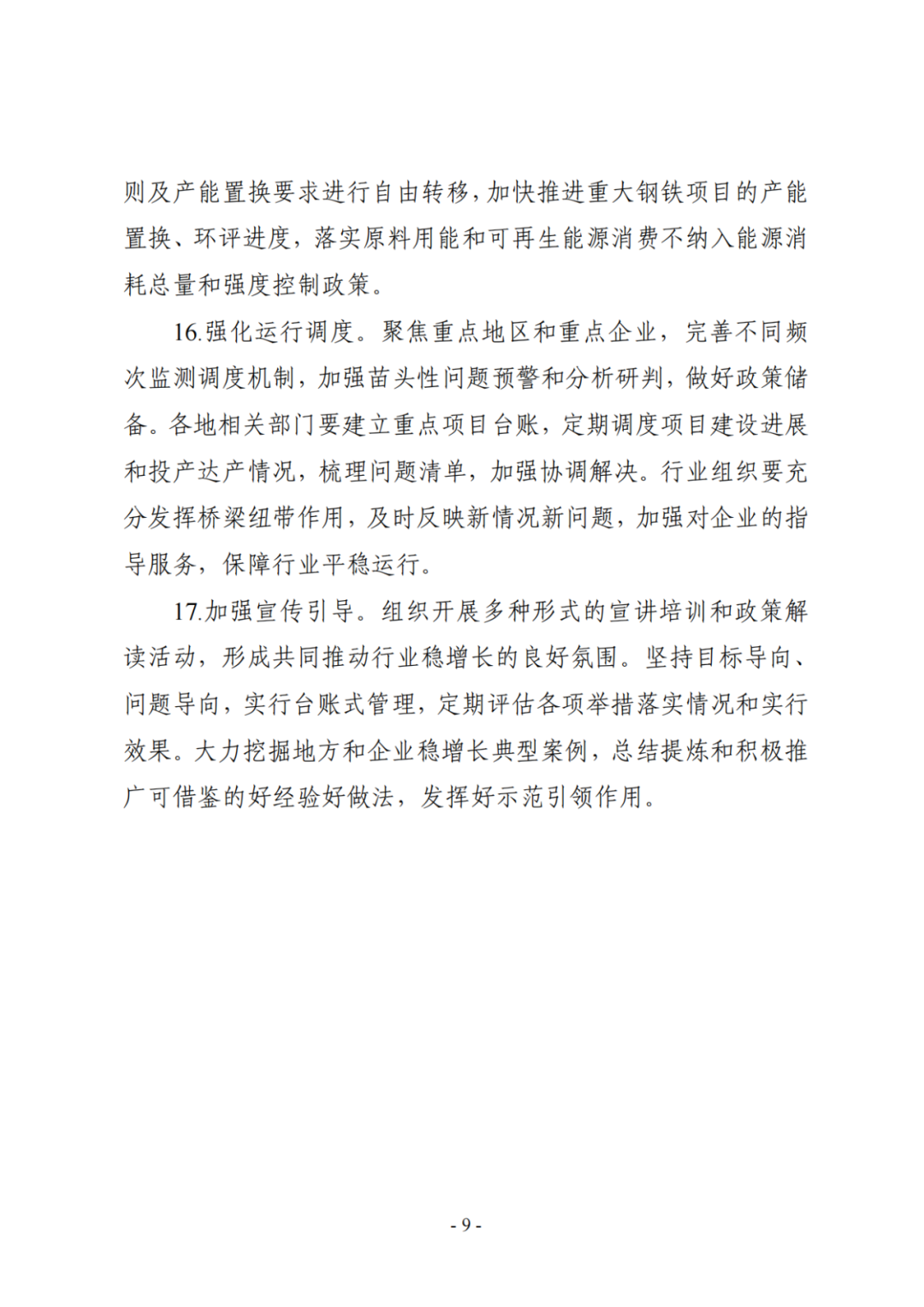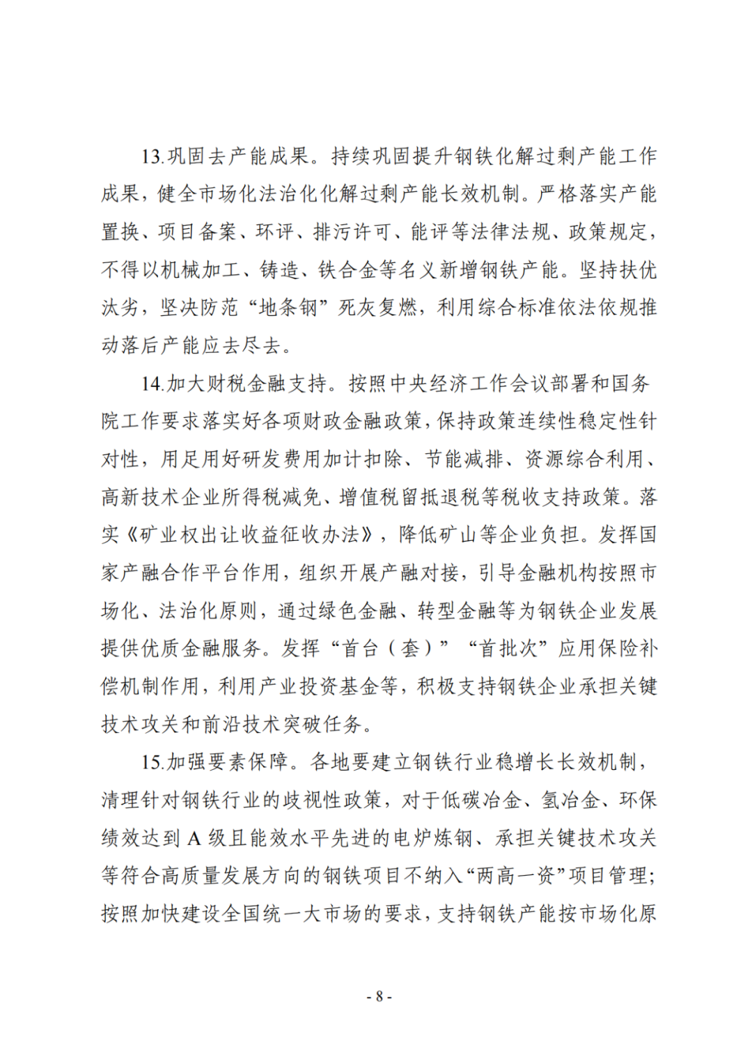 加强要素保障。各地要建立钢铁行业稳增长长效机制,清理针对钢铁行业的歧视性政策,对于低碳冶金、氢冶金、环保绩效达到A级且能效水平先进的电炉炼钢、承担关键技术攻关等符合高质量发展方向的钢铁项目不纳入“两高一资”项目管理;按照加快建设全国统一大市场的要求,支持钢铁产能按市场化原则及产能置换要求进行自由转移,加快推进重大钢铁项目的产能置换、环评进度,落实原料用能和可再生能源消费不纳入能源消耗总量和强度控制政策。