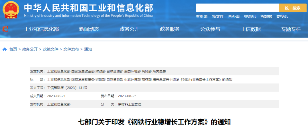 8月25日,国家工信部、发改委、财政部、自然资源部、生态环境部、商务部和海关总署联合印发了《钢铁行业稳增长工作方案》。