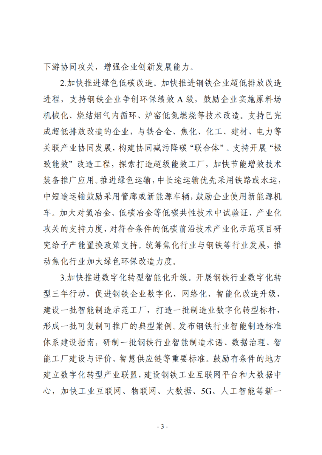 加快推进绿色低碳改造。加快推进钢铁企业超低排放改造进程,支持钢铁企业争创环保绩效 A 级,鼓励企业实施原料场机械化、烧结烟气内循环、炉窑低氮燃烧等技术改造。支持已完成超低排放改造的企业,与铁合金、焦化、化工、建材、电力等关联产业协同发展,构建协同减污降碳“联合体”。支持开展“极致能效”改造工程,探索打造超级能效工厂,加快节能增效技术装备推广应用。推进绿色运输,中长途运输优先采用铁路或水运,中短途运输鼓励采用管廊或新能源车辆,鼓励企业使用新能源机车。加大对氢冶金、低碳冶金等低碳共性技术中试验证、产业化攻关的支持力度,对符合条件的低碳前沿技术产业化示范项目研究给予产能置换政策支持。统筹焦化行业与钢铁等行业发展,推动焦化行业加大绿色环保改造力度。