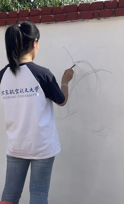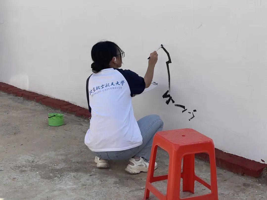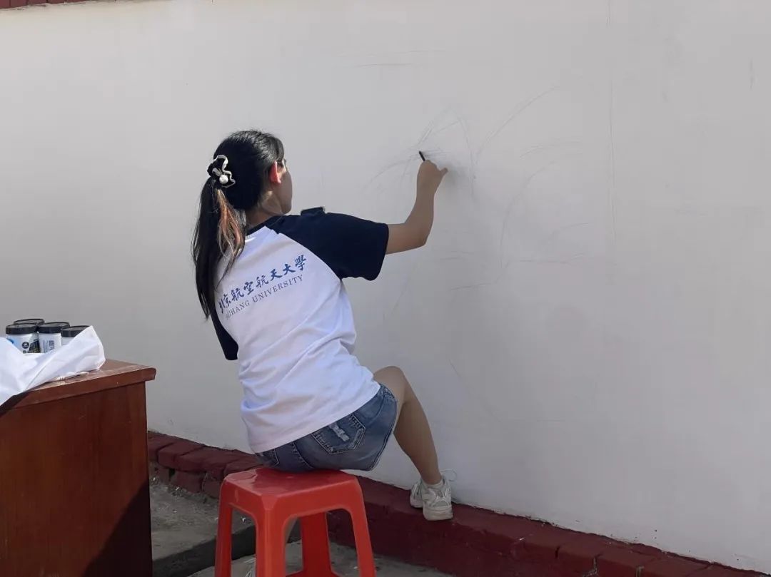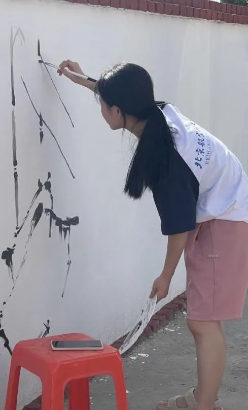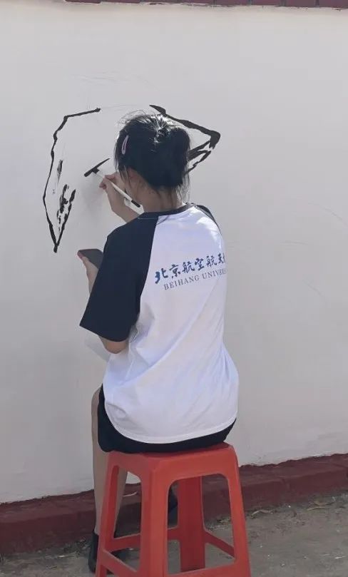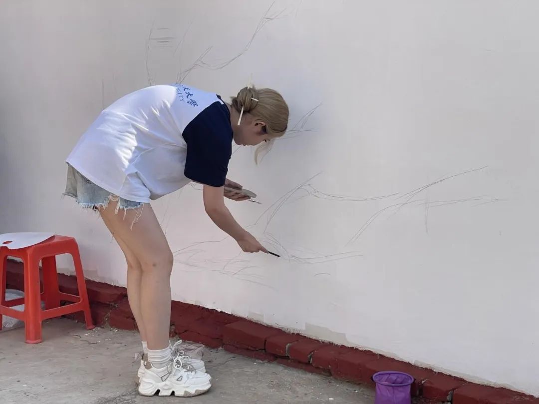 实践队分工合作,以国风的图案帮助乡村建设精神文明上增添了一笔传承的色彩。