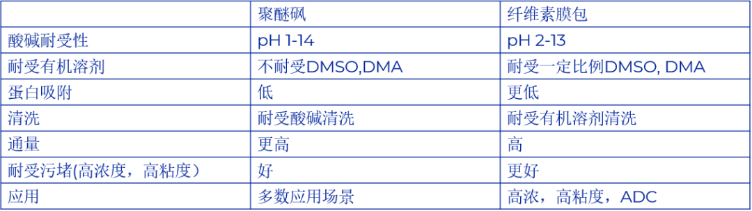 超滤膜的上层为非常薄的近似“皮肤”的截留层,号称皮层(2-8微米左右),主要起分子拦截作用,为了增强纤维强度,中空纤维柱的皮层更厚。皮层材料主要有亲水改性聚醚砜、聚砜、纤维素等。聚(醚)砜膜有更好的机械性能,更高的耐温效果。为了保证纤维的强度,中空纤维柱更多的采用聚砜或者聚醚砜材料。纤维素膜材具有天然的亲水性,表现出比聚醚砜膜更低的蛋白吸附及抗污堵能力,适合高浓度样品的处理。另外,纤维素膜对有机溶剂的兼容性也更好。例如对DMA、DMSO、乙腈等有机溶剂的耐受性。