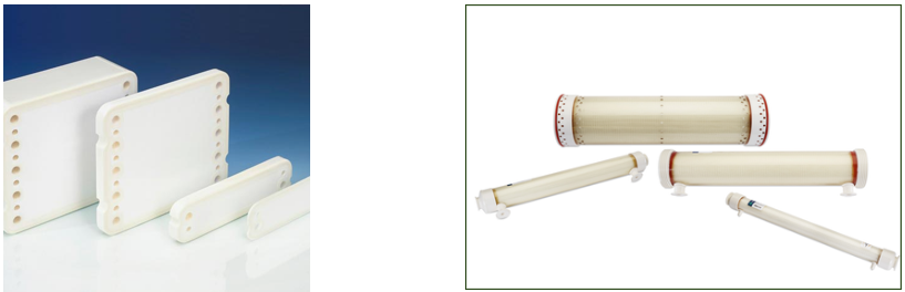 平板膜包的设计通过一张张平面的膜堆叠起来以增加过滤面积,液体样品在膜的表面流动。为了增加传质效率,在膜与膜之间增加了筛网结构。筛网与滤膜之间的位置和筛网的粗细对于液体样品的传质效果有明显影响。普通筛网或者精细筛网有更高的传质效率,从而有更高的透过转化效率,比较适合中低浓度的样品。筛网提供的湍流也可以有效减缓凝胶层的过早出现,从而提高过滤效率。但筛网的存在也增加了对样品的剪切力。