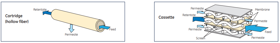 Cytiva中空纤维柱,包括适用于小量样品的MidGee系列和中试放大及商业化生产的MaxCell系列。具有1 KD、3 KD、5 KD、10 KD、30 KD、70 KD、100 KD、300 KD、500 KD、750 KD等不同截留分子量选择。滤膜为不对称海绵孔结构,中空纤维丝直径有0.25 mm、0.50 mm、0.75 mm、1.00mm等。长度有30 cm、60 cm、110 cm,面积从16 cm2-28 m2。相同纤维孔径和长度的产品,都具有从实验室规格到商业化生产的规格,具有很好的放大扩展性。为了满足无菌生产环境,可以使用可高压灭菌、在线灭菌 (SIP) 产品、以及一次性预灭菌产品ReadyToProcess。
