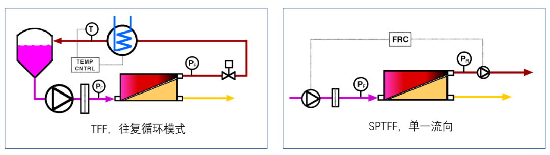 单向切向流过滤 (SPTFF) ,作为Pall专利技术,与传统TFF过滤相比,单向切向流通过串联多级膜包,利用空间换时间,料液仅一次通过工作泵和膜包,样品无需经过反复循环,加料罐没有滋生泡沫的困扰,从而有效减少样品受到剪切力的影响。