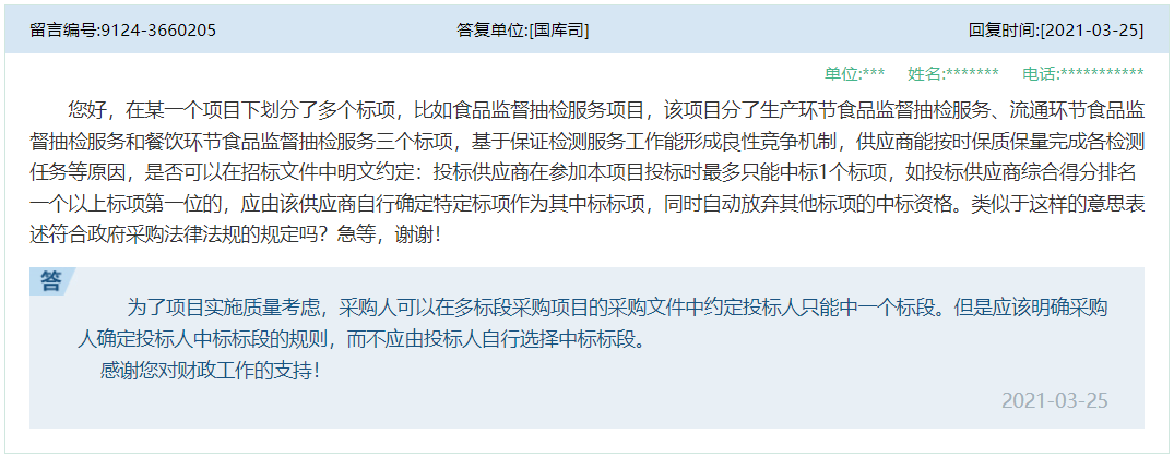 答: 为了项目实施质量考虑,采购人可以在多标段采购项目的采购文件中约定投标人只能中一个标段。但是应该明确采购人确定投标人中标标段的规则,而不应由投标人自行选择中标标段。