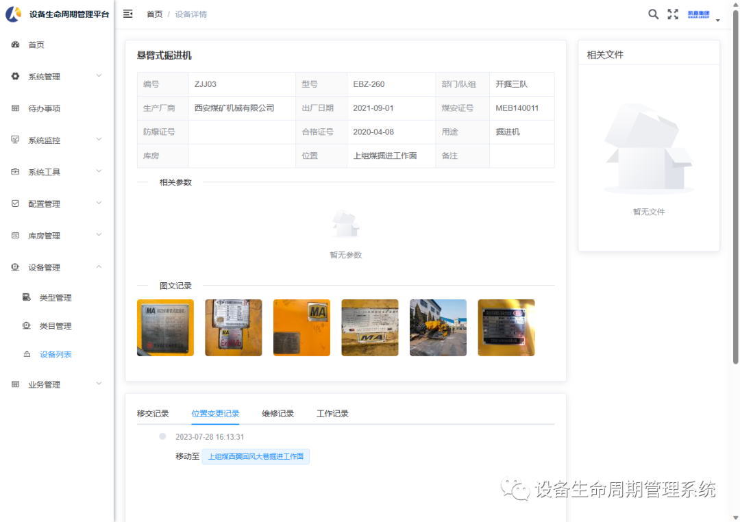 另外设备全生命周期管理平台提供了一整套完善的工作流程。员工可以通过平台提交设备检修申请和设备调拨申请。这种数字化的工作流程不仅能够加快申请流程,减少因信息传递不畅造成的延误,还可以更好地跟踪设备的移交情况、维修历史和保养情况。除此之外,平台还可维护了设备基本参数信息、图文、电子文档。需要查看相关文件时,不再需要翻找纸质文件,通过平台找到相关设备即可直接查看电子文档及图片。并且还可以通过平台查看设备移交记录、位置变更记录、维修记录、工作记录。