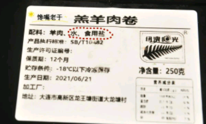 首先,买真羊肉卷很简单,也是先看配料表,只要原材料中只标注“羊肉二字”,记住就这两字,除了羊肉之外,再也没有任何调味料、辅料以及各种添加剂,那么,这就是真羊肉卷。