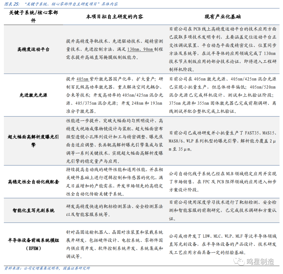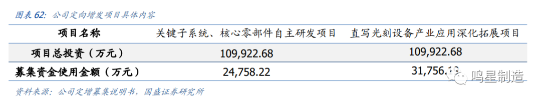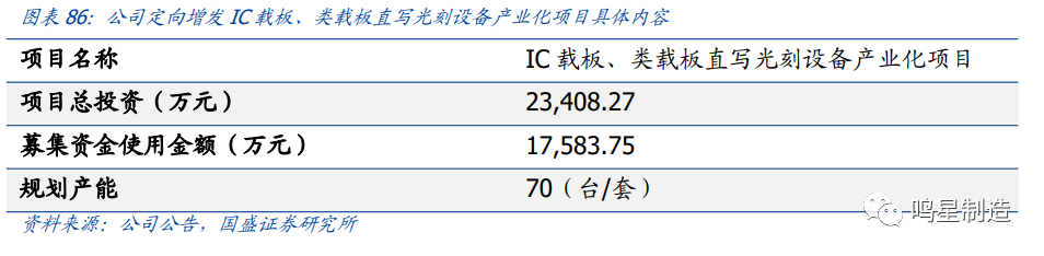 定向增发支撑IC载板产能扩张与技术进步。2022年,公司向特定投资者发行总额不超过7.98亿元的资金用于四个项目的建设,其中包含“IC载板、类载板直写光刻设备产业化项目”。该项目拟建设现代化的IC载板、类载板直写光刻设备生产基地,推动公司直写光刻设备产品体系的高端化升级,提升直写光刻设备产品利润水平。预计达产后将形成年产量70(台/套)直写光刻设备产品的生产规模。