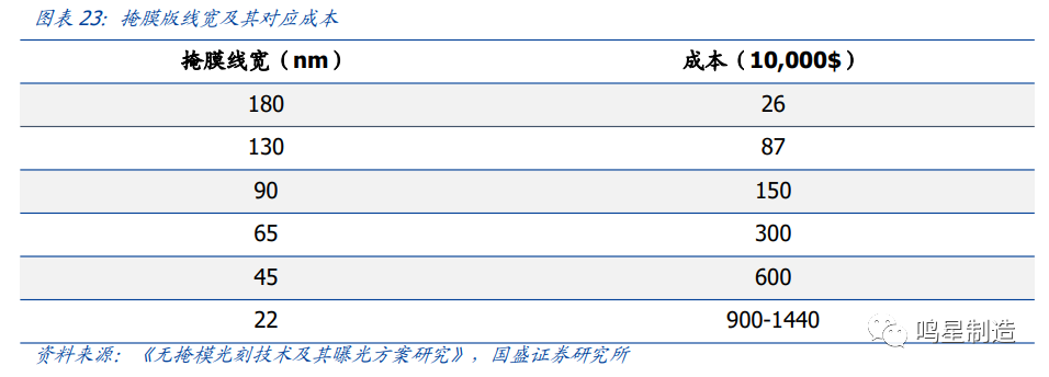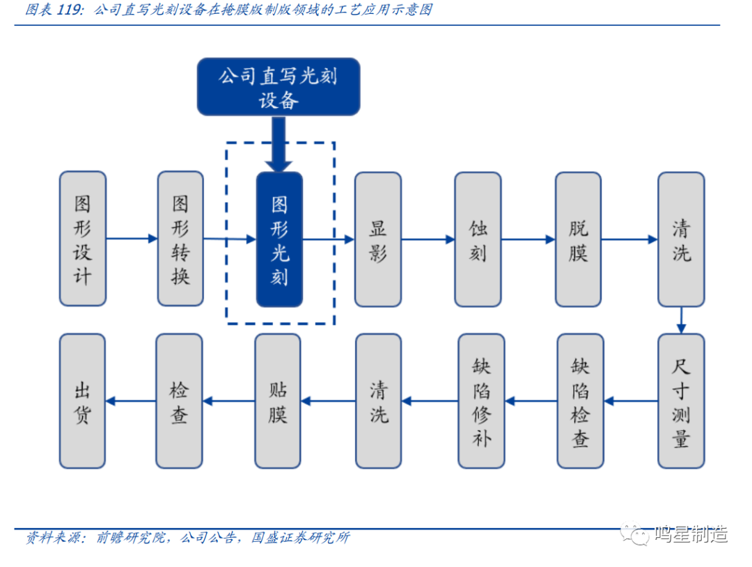 4)掩膜版制版:精度要求高,公司90nm-65nm制版光刻设备在研中。公司90nm-65nm制版光刻设备研制进行中,将覆盖国内70-80nm掩膜版产能。