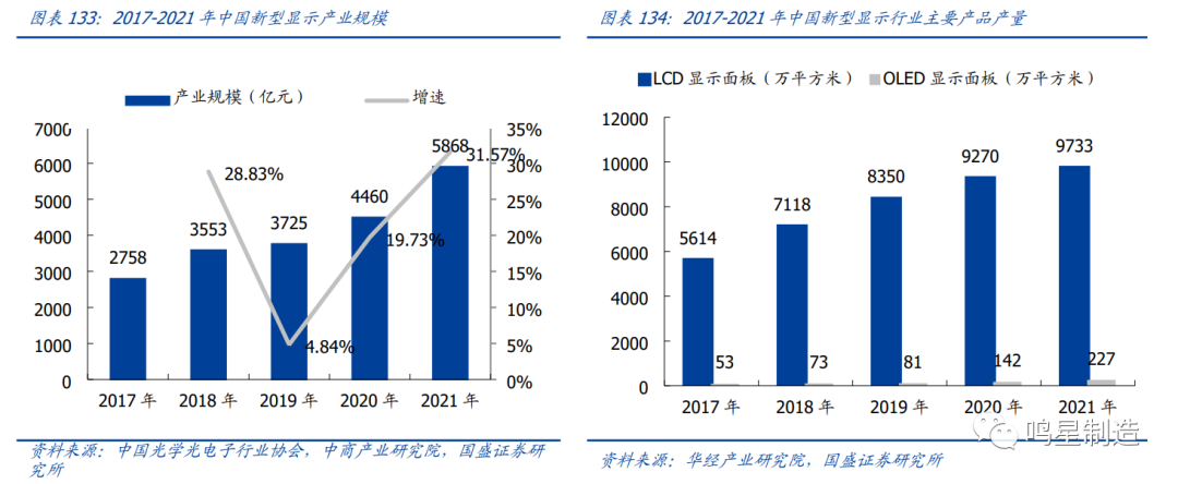 中国新型显示市场持续扩张,增长势头强劲。中国新型显示产业规模呈现逐年提升的态势,从2017年的2758亿元提升至2021年的5868亿元,CAGR为20.77%,虽然2019年增速放缓,但2021年同比上涨了31.57%,增长势头强劲。目前,中国新型显示主要产品为LED和OLED,其中LCD产量从2017年的5614万平方米上涨至2021年的9733万平方米,CAGR为14.75%,OLED产量从2017年的53万平方米上涨至2021年的227万平方米,CAGR为43.86%,两者均呈现逐年上涨的趋势。