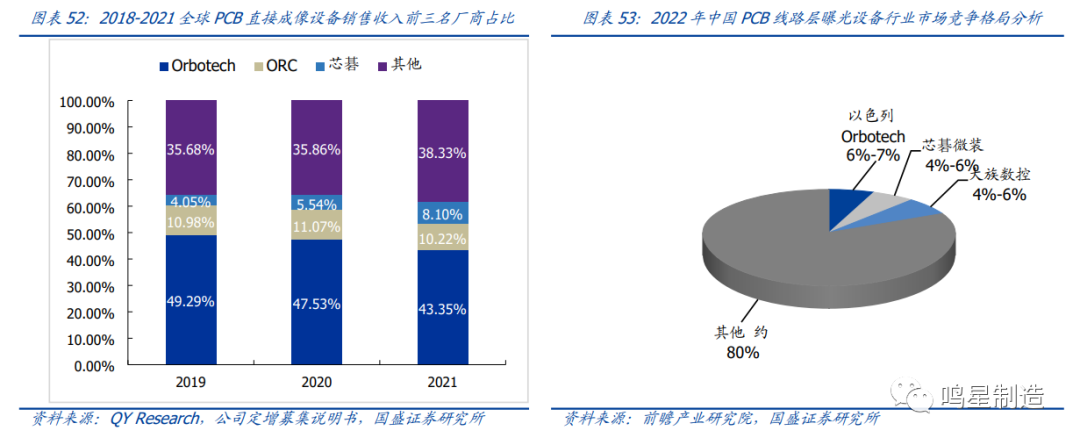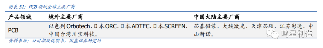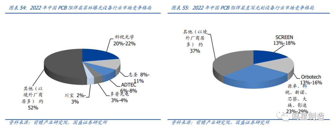 *线路层曝光设备中:2022年,以色列Orbotech占中国PCB线路层曝光设备市场份额比重约6%-7%左右,国内厂商中,芯碁微装以4%-6%的市场份额位居前列。