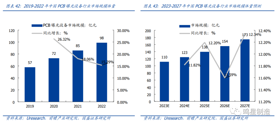 终端需求驱动下游PCB制造行业竞相扩产,进而驱动PCB曝光设备市场规模持续扩张。5G、人工智能、大数据、物联网、服务器存储等行业的蓬勃发展和逐步渗透给PCB产品的需求提供动力,下游PCB制造行业具备良好市场增长前景。下游PCB制造行业中多家代表企业纷纷扩产,2018-2022年中国PCB制造行业TOP10企业固定资产复合增速平均值可达17.65%。下游扩产计划有利于拉动上游PCB曝光设备行业市场规模保持增长态势,PCB曝光设备行业市场规模从2019年的57亿元增长至2022年的98亿元,2019-2022年的复合增长率为19.80%;据Uresearch预测数据表示,预计到2027年,中国PCB曝光行业市场规模将高达173亿元。这一持续上涨态势在线路层和阻焊层也同样有所体现: