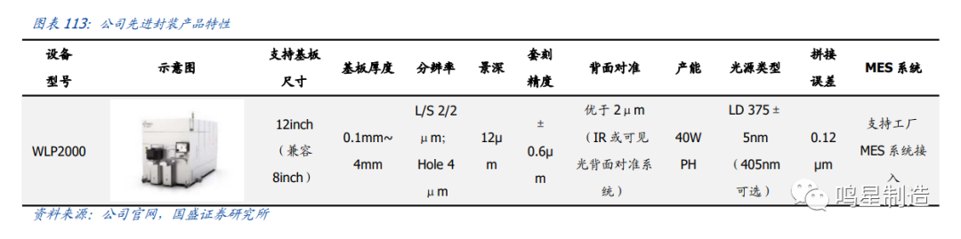 公司先进封装产品优势明显,产品矩阵不断扩充。公司先进封装领域设备主要为WLP2000。WLP2000直写光刻机采用最先进的数字光刻技术,无需掩膜版,可直接将版图信息转移到涂有光刻胶的衬底上,主要应用于8inch/12inch集成电路先进封装领域,包括Flip Chip、Fan-In WLP、Fan-Out WLP和2.5D/3D等先进封装形式。WLP2000直写光刻机采用多光学引擎并行扫描技术,具备自动套刻、背部对准、智能纠偏、WEE/WEP功能,在RDL、Bumping和TSV等制程工艺中优势明显。