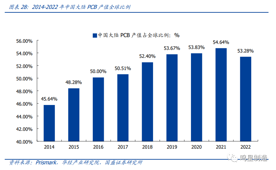 中国大陆仍保持PCB核心市场的地位。从中国市场占全球市场规模来看,Prismark数据显示,中国大陆PCB产值占全球PCB总产值占比已由2014年的45.64%上升到2021年的54.64%。从2016年开始,中国大陆PCB市场占全球产值比例开始在50%以上,2022年占全球的53.28%保持首位。据Prismark预测2022-2027年中国大陆地区PCB产值复合增长率约为3.3%,预计到2027年将达到511.33亿美元,保持稳健增长。