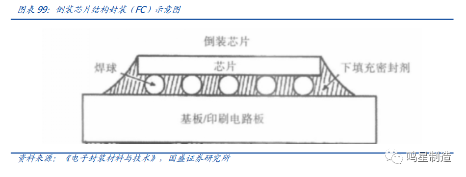 *倒装芯片结构封装(Flip Chip)。倒装就是将芯片倒过来,将有源区面朝下对着PCB基板,从而区别于以往的封装技术(将芯片有源区面朝上)。在倒装芯片封装中,硅芯片使用焊料凸点(Bump)实现芯片与基板的互联,而非用焊线直接固定在基材上,从而提供密集的互连。除此之外,为了保证可靠性和稳定性,还会使用毛细底部填充材料(CUF)或模塑底部填充材料(MUF)对热应力进行再分布。由此,倒装芯片结构封装(FC)可在微型化上进一步拓展,实现最短的电路径,减少封装面积,保证更高的速度和更少的寄生效应,增加引脚数量。在消费、网络、计算、移动和汽车市场上,倒装芯片结构封装(FC)是一系列应用中的关键技术。