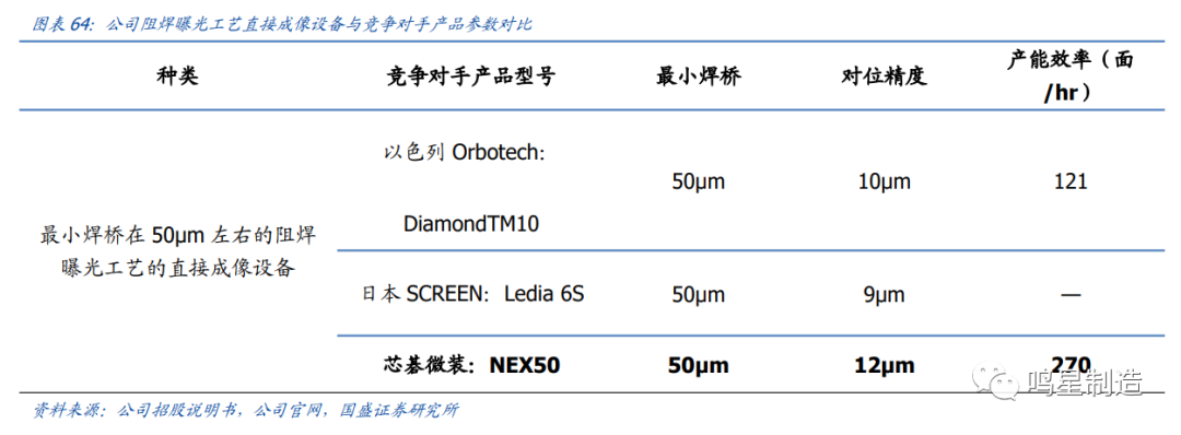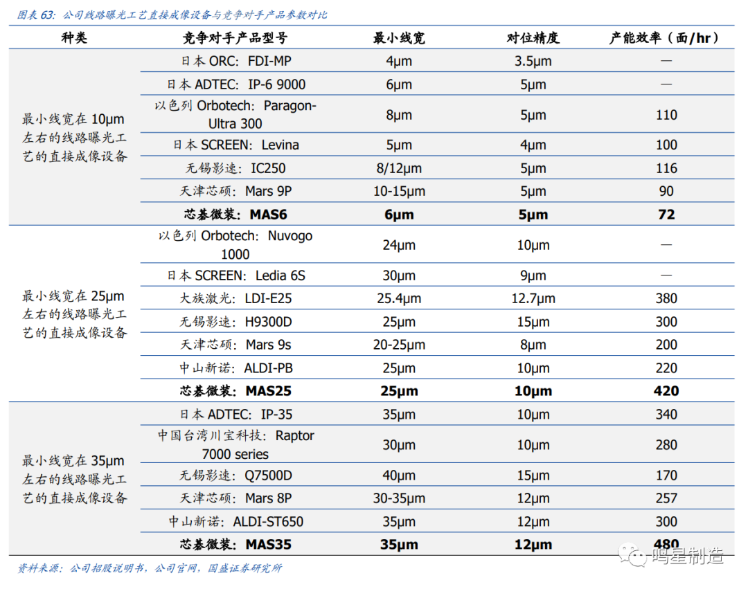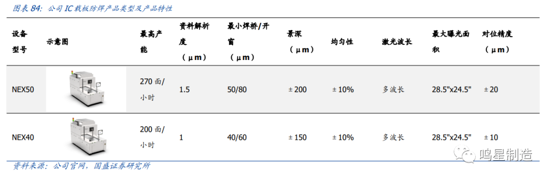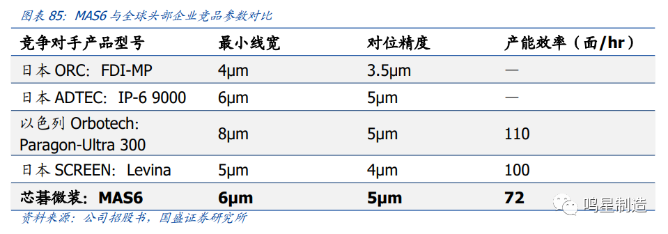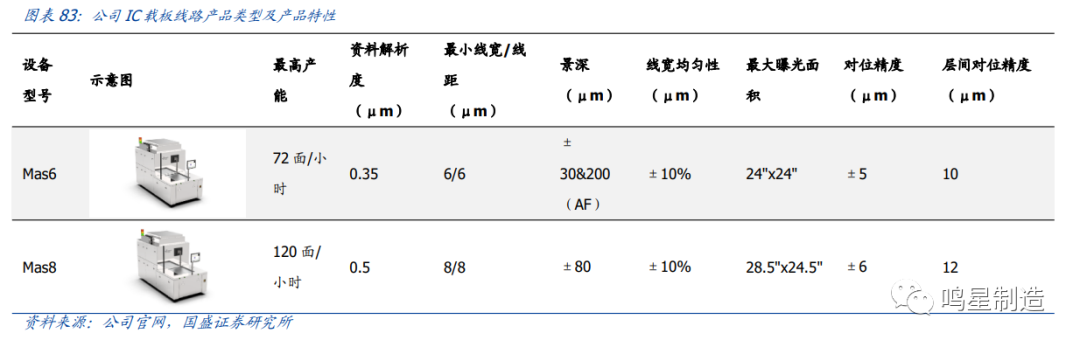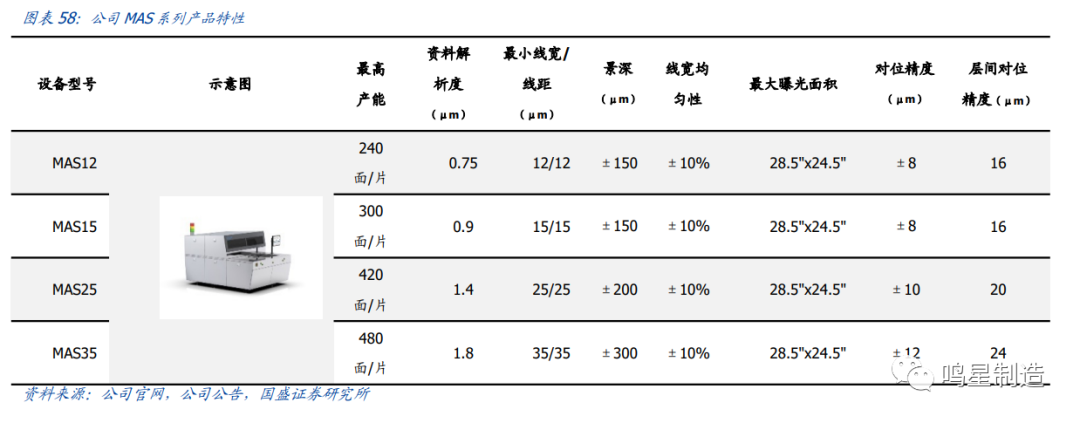 技术优势趋显,公司MAS系列部分产品已接近或超越全球头部企业。针对IC载板领域,公司具有丰富的产业化成果,在IC载板防焊上有NEX50、NEX40产品,在IC载板线路上有MAS系列产品,其中的MAS6和 MAS8产品用于精细化要求高的 IC载板领域,可分别实现6μm和8μm的高度解析。以MAS6为例,其最小线宽/线距达到6微米,对位精度达到±5μm,产能72面/h,资料处理精度为0.35μm,已接近或超越部分ADTEC、SCREEN、ORC、Orbotech等全球头部企业竞品。公司的IC载板直写光刻设备均采用先进的DMD技术,可使镭射光束在不同种类的感光膜上曝光。MAS系列产品均可适用于多种靶点、多种涨缩模式、多种变形模式,同时还能实现全自动连线生产。除此之外,公司也在规划4μm的IC载板直写光刻设备,以便满足未来市场的技术发展需要。
