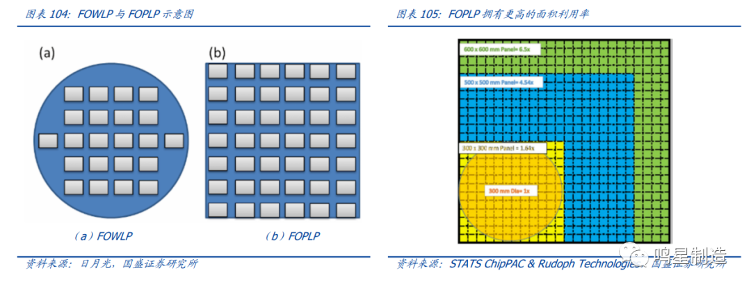 *面板级封装(Panel Level Package,简称PLP)。Fan-out有两个大类,分别为晶圆级封装(Fan-Out Wafer Level Packaging,简称FOWLP)以及面板级封装(Fan-Out Panel Level Packaging,简称FOPLP),后者相对于前者是一种更高效的封装技术,原因在于与晶圆级封装(FOWLP)不同的是,面板级封装(FOPLP)是将切割下来的晶粒重组于方形的载体panel上,而不是圆形的载体wafer上。由于方形的载体panel与矩形的芯片形状一致,因此与圆形的载体wafer相比,前者可以大大减少边角料的浪费,节约成本。根据STATS ChipRAC和Rudoph Technologies数据显示,一片500x500mm panel可处理的die数量是300mm wafer的4.54倍,600x600mm panel 是6.5倍。由此可见面板级封装(FOPLP)拥有更高的材料与面积利用率,可以节约更多的成本,获得更高的封装效率。但面板级封装也对光刻、对准、翘曲等技术提出了更高的要求。