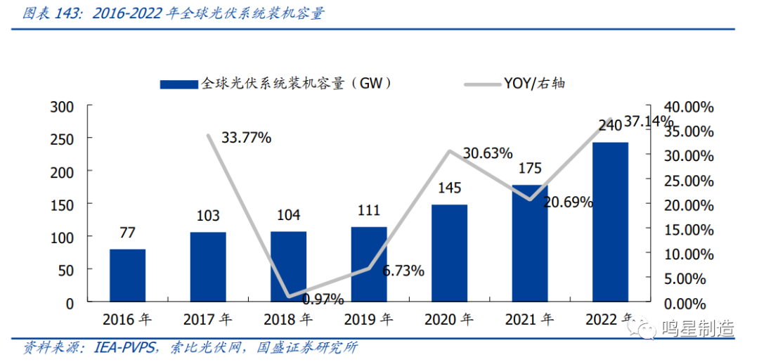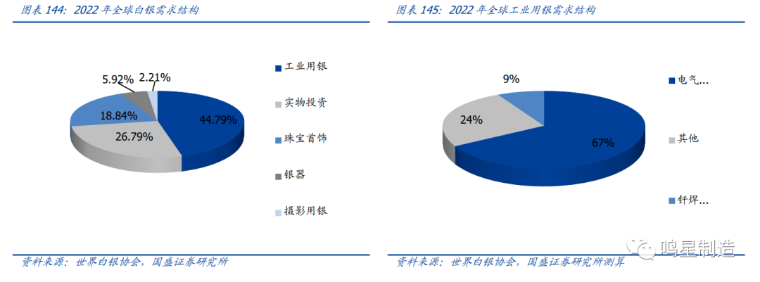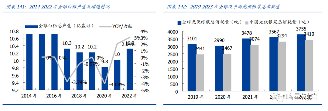 光伏用银需求量大且增速高、而银浆供给短缺,以铜代银势在必行。全球白银供给保持平稳:2022年全球白银产量为10.3亿盎司,同比增长率为3%。在2014-2022年期间,全球白银产量始终在9-11亿盎司之间波动,供给趋稳。光伏用银需求量激增:2022年全球光伏装机量达到240GW,同比增长37.14%,未来光伏装机量仍然保持高速增长,同时也意味着光伏用银需求量在未来将迅速增加。而工业用银是全球白银需求结构中最大的组成部分,占比44.79%,工业用银中光伏用银占比达到25%,占总需求的11.29%。在光伏市场不断扩大而白银产量保持平稳的背景下,光伏用银占总需求的比例会不断增大,从而挤占其他行业用银需求,将带来银价上涨,但是光伏行业对成本的要求较高,因此去银化将成为光伏行业的必然趋势。