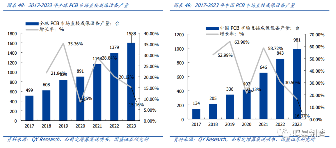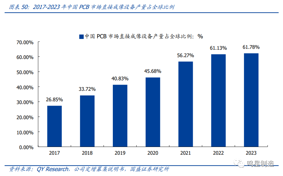 随着PCB产能向中国大陆地区转移,我国直接成像设备市场规模快速增长。根据QY Research数据,全球PCB市场直接成像设备产量在2017年为499台,预计至2023年,全球PCB市场直接成像设备产量将达到1588台,复合增长率为21.28%。同时,中国PCB市场直接成像设备产量从2017年的134台增至23年的981台,复合增长率为39.35%,超过相应全球复合增长率。从2021年起,中国PCB市场直接成像设备占全球比例均位于56.27%以上,是最大的PCB直接成像设备市场。