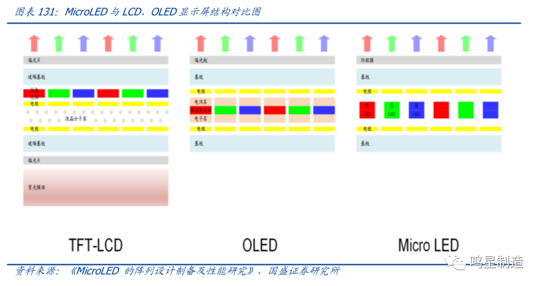MicroLED。依据LED尺寸定义,芯片尺寸小于100或50μm的LED定义为MicroLED,根据芯片面积定义,芯片面积小于2500μm2的LED为MicroLED。MicroLED是指高密度集成的LED 阵列,每个LED尺寸为数十微米,是一种自发射器件,单像素能够产生高亮度,可以实现每一个像素点的控制和单点光驱动。MicroLED结合了LCD和OLED显示的优点,首先MicroLED显示作为自主发光显示没有背光源,比LCD功耗更低,结构更简单,体积更小;相比OLED, MicroLED无机的发光单元比OLED的有机发光单元寿命更长。并且MicroLED可以作为手机、手表、AR/VR、TV等设备的显示屏。随着4G、5G技术的成熟,4K、8K电视将更加普及,这也为MicroLED提供了巨大的市场。所以,MicroLED利用无机LED器件作为发光像素来实现主动发光矩阵式显示,在功耗、分辨率、对比度、寿命等方面均超过了目前主流的LCD和OLED。其驱动方式一般分为有源驱动技术和无源驱动技术两钟。