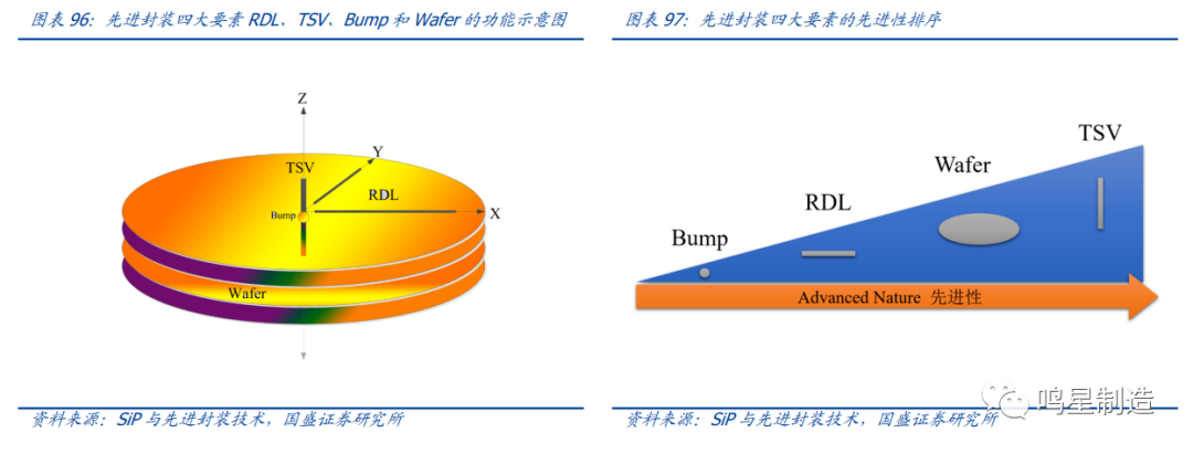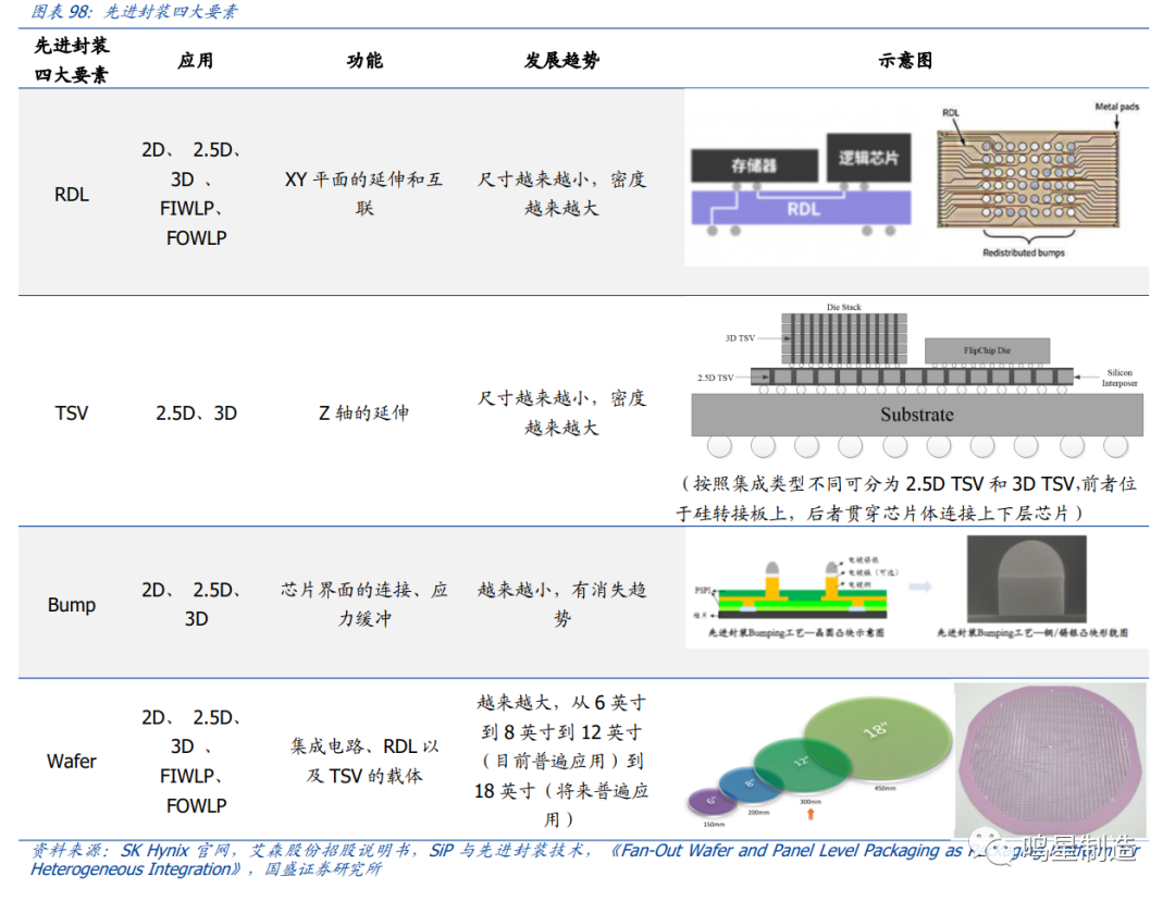 先进封装四大要素为RDL(ReDistribution Layer,即重布线层)、TSV(Through Silicon Via,即硅通孔)、Bump(凸点)和Wafer(晶圆)。其中,只要含有其中1-2种技术的封装方式都可以称为先进封装。从功能来看,RDL是用于XY平面的延伸和互联,TSV是用于Z轴的延伸,Bump是用于芯片界面的连接并起到应力缓冲的作用,Wafer是集成电路、RDL以及TSV的载体。