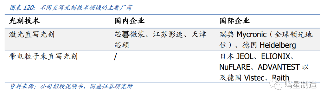 *目前FPD制造对于光刻精度要求不高,但高世代产线均采用投影式光刻技术(满足曝光精度要求并可实现大批量产业化生产),直写光刻设备可应用于低世代产线中,但在高世代产线中还未有产业化的应用。目前,FPD投影式光刻设备的主要厂家包括日本Nikon、Canon、美国Rudolph以及上海微电子(国内)等,其中前两者占据了FPD高端光刻设备的主要市场份额。在低世代产线中,直写光刻设备能够实现最小线宽低于1μm的光刻精度,可应用于客户小批量、多批次产品的生产以及新产品的研发试制。该领域内直写光刻技术国外竞争对手主要是德国Heidelberg等。