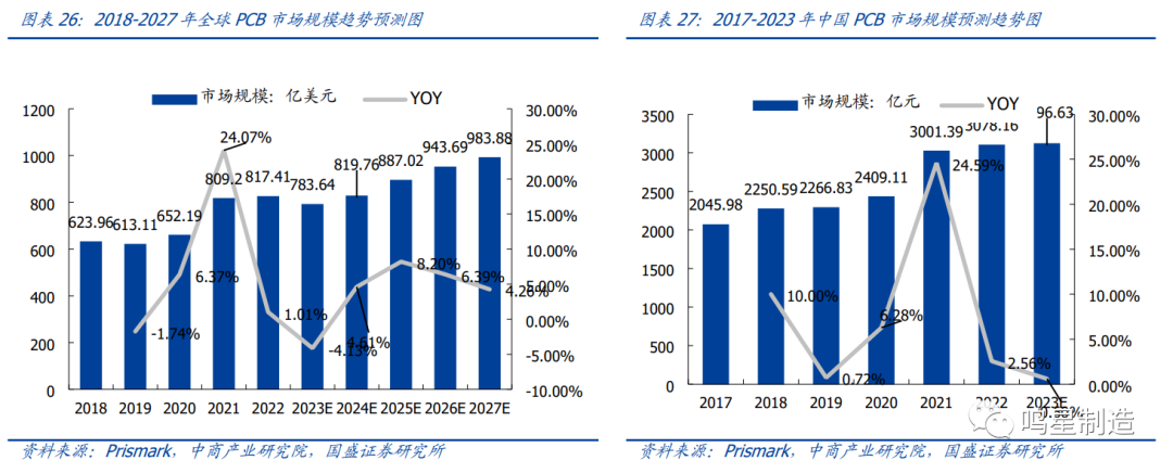 PCB产业整体趋势向稳。作为“电子产品之母”,据Prismark的统计数据,2022年全球PCB产业总产值达817.41亿美元,同比增长1.01%,预计2022至2027年之间,全球PCB行业产值将以3.8%的年复合增长率增长,到2027年将达到983.88亿美元。中国市场方面,得益于全球PCB产能向中国转移以及下游产业的迅速发展,2021年中国PCB的市场规模出现了显著的增长,达3001.39亿元,同比增长24.59%。目前来看,虽然全球消费电子和汽车行业需求疲软,对PCB行业造成了一定的压力,但得益于消费电子的底部复苏、以及AI带动算力需求的背景下,服务器、通信等下游板块高增长,根据Prismark预测,2023年中国PCB产值仍然会维持高位,预测产值为3096.63亿元。