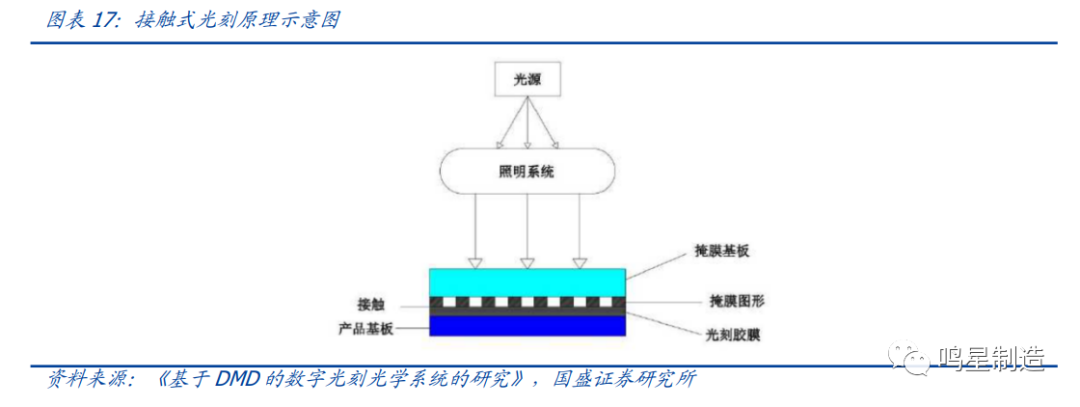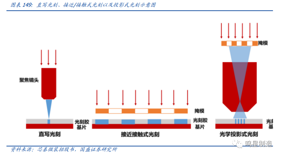 掩膜光刻:是由光源发出的光束经掩膜版在感光材料上成像。具体可分为接触式光刻,接近式光刻,投影式光刻。