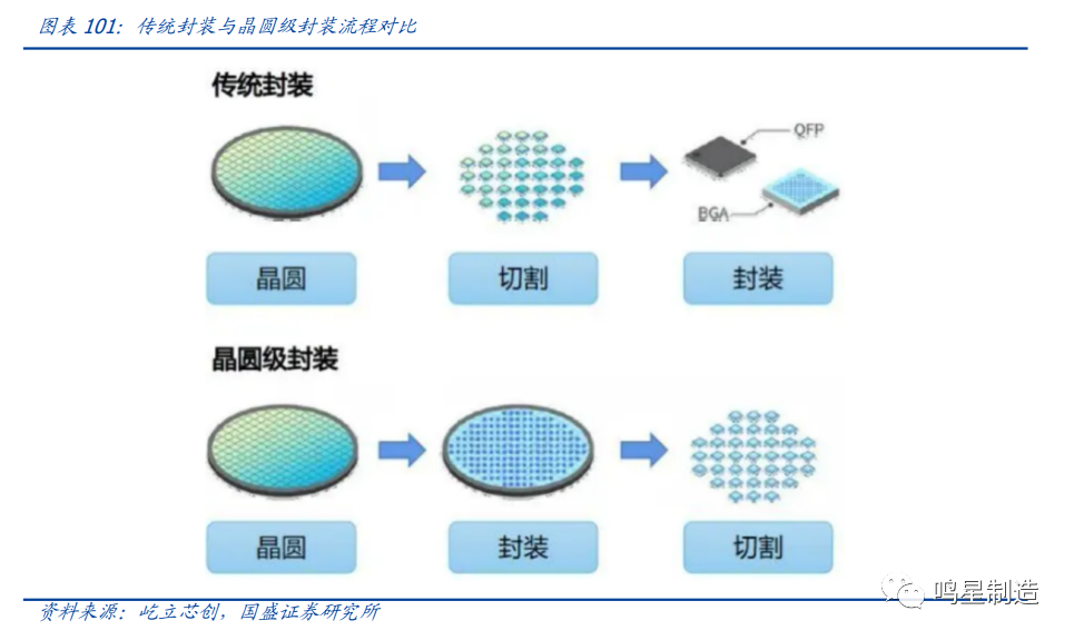 *晶圆级封装(WLP)。晶圆级封装(WLP)是直接先在整片晶圆上同时对众多芯片完成大部分或全部的封装测试,再切割成单颗成品(与传统封装中先切割再封装不同)。与倒装芯片结构封装(FC)类似,晶圆级封装(WLP)也利用晶圆凸块来与电路板互连,只是前者使用较小的焊接凸块,后者使用较大的焊接凸块,且无填充材料。该封装方式是一种无基板封装,主要工艺为RDL技术。由于可将芯片批量封装制作,实现整个晶圆一次全部封装,因此可以提高产能、简化供应链、降低总体成本,同时信号传输路径更短,散热性更好、体积更小,适用于移动和手持设备等成熟市场,也适用于物联网(IoT)、可穿戴设备和汽车电子等新兴市场。