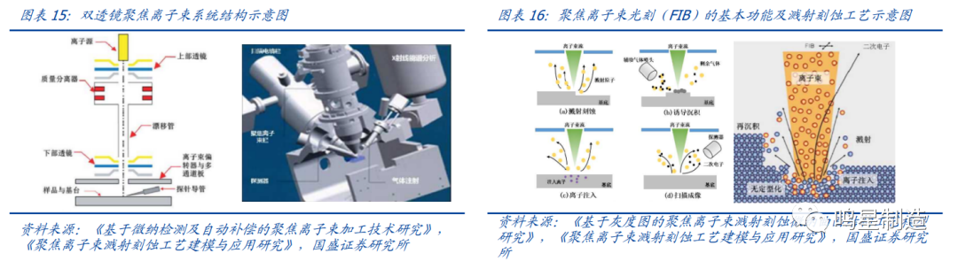 (2)聚焦离子束光刻(Focused Ion Beam,即FIB)。离子束光刻(Ion Beam Lithography,即IBL)可分为投影式离子束光刻(即MIB,使用掩膜版)和聚焦离子束光刻(即FIB,不使用掩膜版)。聚焦离子束光刻(FIB)是一种无掩膜、无电阻的扫描光刻技术,在电场和磁场的作用下,将离子束聚焦到亚微米甚至纳米量级,通过偏转系统和加速系统控制离子束,实现微细图形的检测分析和纳米结构的无掩模加工。聚焦离子束曝光与电子束曝光本质上是一致的,不同的是前者使用离子束而不是电子束来写入图案。由于离子质量远大于电子,因此散射率较低,使得聚焦离子束曝光能够获得更高的分辨率和灵敏度。其离子源主要为液态金属(原子量较重可产生更高的溅射产率),其中最常使用的为镓(熔点较低)。聚焦离子束光刻(FIB)系统的功能十分强大,可以实现溅射刻蚀、诱导沉积、离子注入、扫描成像四种功能。