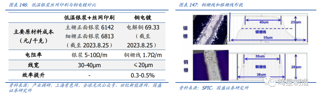 *提效方面:纯铜栅线保证高导电性,低线宽减少功率损耗。转换效率方面,采用铜栅线工艺的电池电阻率更低、栅线线宽小,且栅线平整度高,整体的电池转换效率比原有银栅线提高约0.3%~0.5%,具有效率优势: