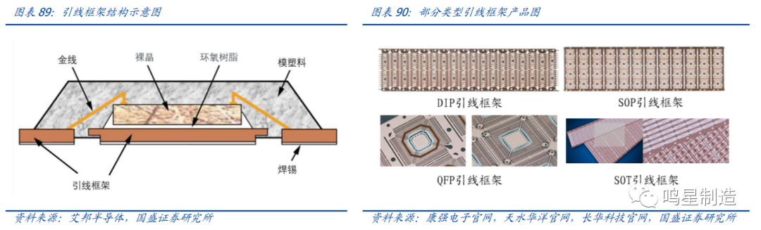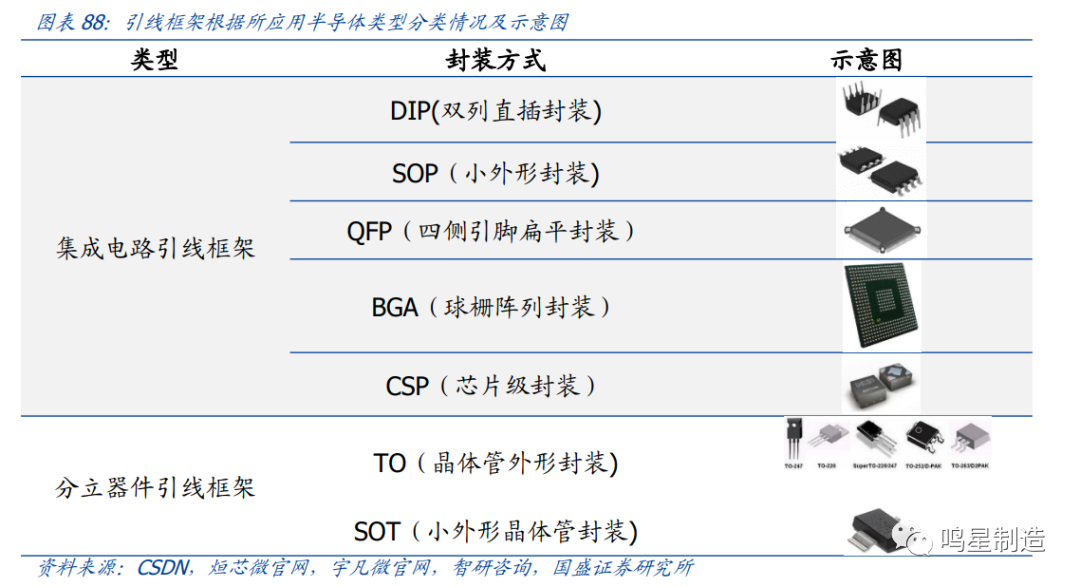 引线框架是集成电路的芯片载体,目前仍具市场空间,可分为集成电路引线框架和分立器件引线框架。引线框架是指借助于键合材料(金丝、铝丝、铜丝)来实现芯片内部电路引出端与外引线的电气连接的一种芯片载体。引线框架是封装材料中仅次于IC载板的第二大封装材料,由于其结构简单、制造成本较低,且绝大部分的半导体集成块中都需要使用引线框架,因此目前引线框架仍具备一定市场空间。在分类上,由于不同的引线框架常是以对应半导体的不同封装方式来命名,故根据引线框架应用于不同类型的半导体,可分为集成电路引线框架和分立器件引线框架。其中集成电路引线框架按生产工艺分类,又包含DIP、SOP、QFP、BGA、CSP 等封装方式,而分立器件引线框架则主要是TO、SOT两种封装方式。