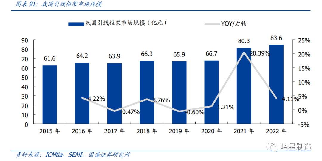 引线框架市场需求持续增长。根据ICMtia、SEMI、QY Research数据,2021年全球引线框架市场规模约为38.2亿美元,同比增长20.13%。预计到2023年将增至39.9亿美元,2027年将达到44.75亿美元,2021-2027的CAGR为3.9%。从国内来看,2021年我国引线框架市场规模约为80.3亿元,同比增长20.39%,2022年增长至83.6亿元,YOY为4.11%。