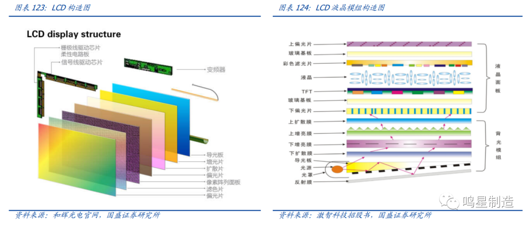 *液晶显示(LCD)。LCD是第二代显示技术,属于非自发光型显示器,即自身不具有发光特性,是利用背光模组提供光源。其构造是在两片平行的玻璃基板当中放置液晶盒,下基板玻璃上设置TFT(薄膜晶体管),上基板玻璃上设置彩色滤光片,通过TFT上的信号与电压改变来控制液晶分子的转动方向,从而达到控制每个像素点偏振光出射与否而实现单个像素颜色的显示。可广泛用于电视、笔记本电脑、桌面显示器、手机、数码相机、车载设备等。液晶显示(LCD)的缺点在于效率低(背光层发出的光经过多层穿透存在较大程度的浪费)、无法显示纯粹的黑色(其显出的黑色是背光屏蔽大部分后显出的)、可视角度问题(从侧面显示画面的效果严重衰减)、颜色不够鲜艳(是RGB滤光片发出,而非像素点自发光)、整体厚度较厚(结构复杂)。