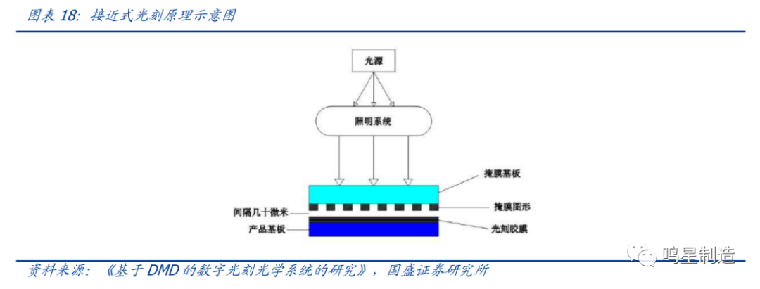 接近式光刻。接近式光刻其曝光过程和接触式曝光一样,只是在掩膜板和表面涂有光刻胶的基板之间的距离上有差别:保持了数微米至几十微米的间隙,然而这种间隙(通常为10-50µm)能造成光衍射误差,使得接近式光刻的分辨率降低。
