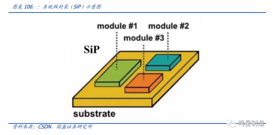 *系统级封装(System in a Package ,简称SiP)。系统级封装就是将多个功能不同的芯片与可选无源器件直接封装成具有完整功能的一个标准功能器件。SiP 作为一种全新的集成方法和封装技术,成为实现高性能、低功耗、小型化、异质工艺集成、低成本系统集成的重要技术方案。国际半导体技术蓝图(ITRS)已经明确 SiP是未来超越摩尔定律的主要技术。从结构上,SiP可以分为两类,一类是二维封装结构(多块芯片平面排布,即2D SiP),一类是三维封装结构(芯片垂直叠装,即3D SiP),其中3D SiP 能最大限度地发挥 SiP 的技术优势。